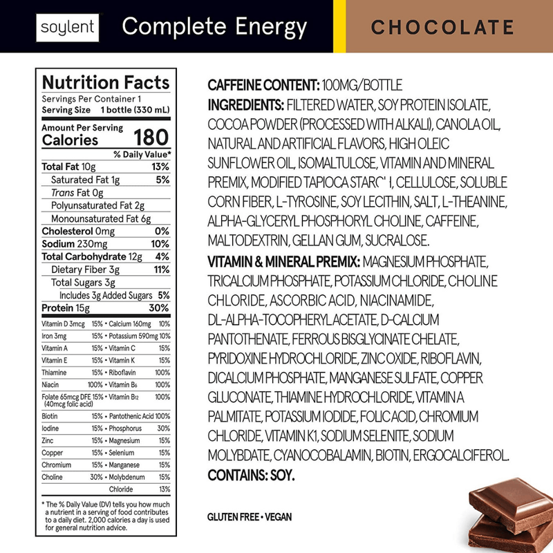 Agua filtrada, aislamiento de proteína de soja, polvo de cacao (procesado con álcali), aceite de canola, sabores naturales y artificiales, aceite de girasol de alto oleico, isomaltulosa, vitamina y mezcla mineral, almidón de tapioca, celulosa, corcorro soluble. FIBRA N, L-FIBRA, Tirosina, lecitina de soja, sal, L-teanina, alfa-glicerilo, fosforilo, colina, cafeína, maltodiftrina, goma gellana, vitamina de sucralosa y premezcla mineral: fosfato de magnesio (magnesio), fosfato tricálcico (Calcio), PO, PO. Cloruro de Tasio (potasio), cloruro de colina (colina), ácido ascórbico (vitamina C), acetato de DL-alfa-tocoferilo (vitamina E), pantenato de D-calcio (ácido pantoténico), quelato de bisglicinato ferroso. ATE (Hierro), PAG. Hidrocloruro de iridoxina (vitamina B6), óxido de zinc (zinc), riboflavina, fosfato de dicalcio (calcio), sulfato de manganeso (manganeso), gluconato de cobre (cobre), clorhidrato de timina (tiamina), palmitato de vitamina A (Vitamina A), POTA, vitamina IODIO DE ASIO (yodo), ÁCIDO FOLICO, Cloruro de Cromo (Cromo), VITAMINA K1, SELENITA DE SODIO (Selenio), MOLIBDATO DE SODIO (molibdeno), CIANOCOBALAMINA (vitamina B12), BIOTINA, ERGOCALCIFEROL (vitamina D2).